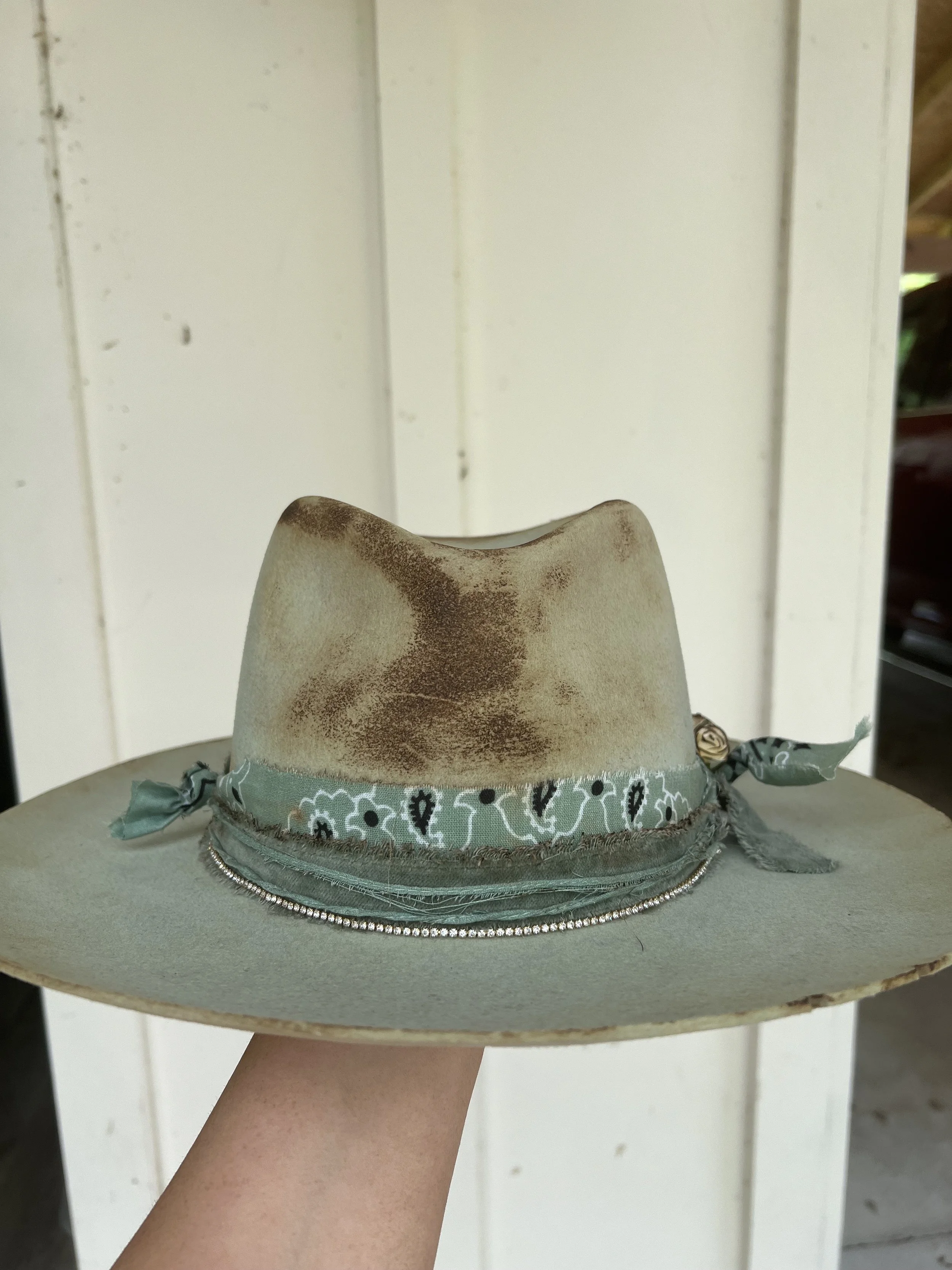 Hats › Burnt Mint Wool Wide Brimmed Hat Image 1 of 5 Image 2 of 5 Image 3 of 5 Image 4 of 5 Image 5 of 5 Burnt Mint Wool Wide Brimmed Hat $195.00 sold out One of a kind wool wide brimmed hat. Hand stitched, decorated, and distressed. This hat is adjustable in size. Sold Out Added! One of a kind wool wide brimmed hat. Hand stitched, decorated, and distressed. This hat is adjustable in size.